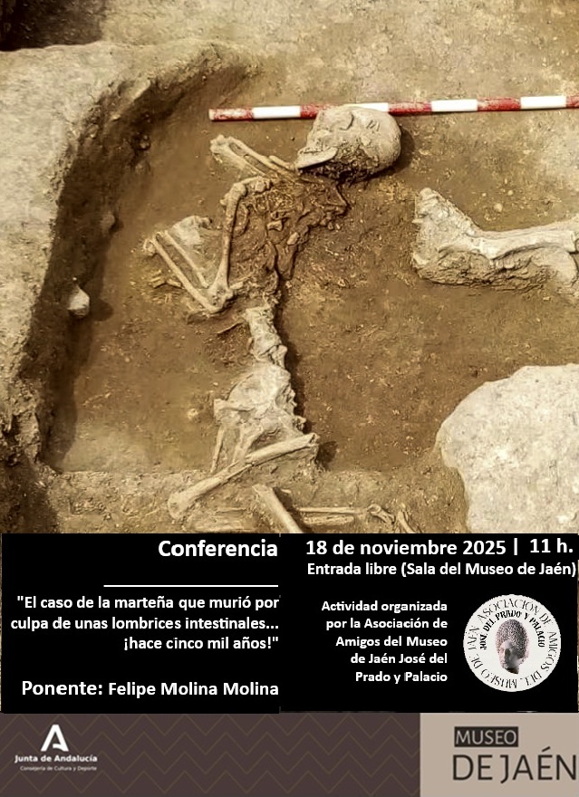 - Conferencia: martes, día 18 de noviembre 2025, a las 11 h.: «El caso de la marteña que murió por culpa de unas lombrices intestinales… ¡hace cinco mil años!«. Ponente: Felipe Molina Molina. Lugar: Sala del Museo de Jaén (Ver conferencia).
